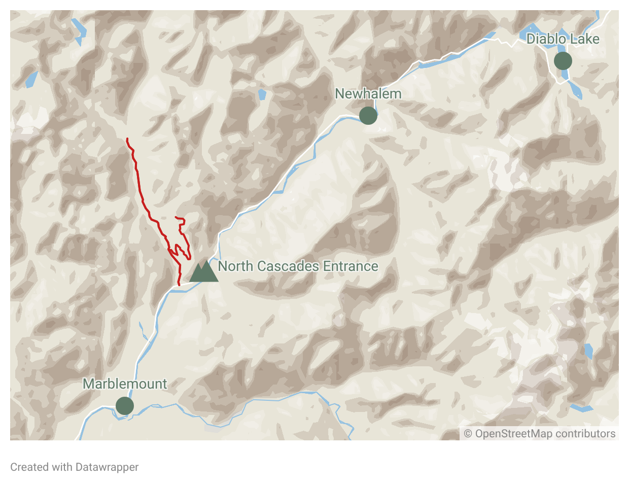 Bacon Creek Road is a north-side forest road east of Marblemount. If you are driving SR-20 west to east, you reach Marblemount first, then the Bacon Creek turnoff, then Newhalem, Diablo, and the higher highway corridor.